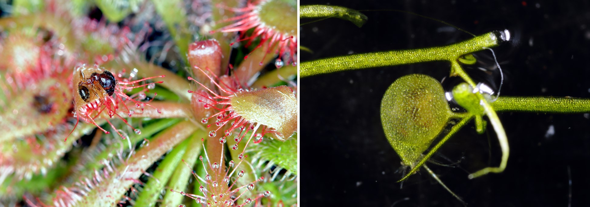 ▍ 小毛氈苔捕食螞蟻 (左)、絲葉狸藻捕捉到獵物的捕蟲囊-捕鼠籠式的捕捉方式(右)