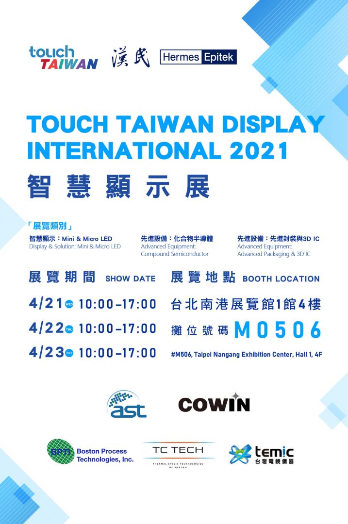 Touch Taiwan 2021 will be held at Taipei Nangang Exhibition Center, Hall 1, 4F from 21st Apr. to 23rd Apr.